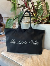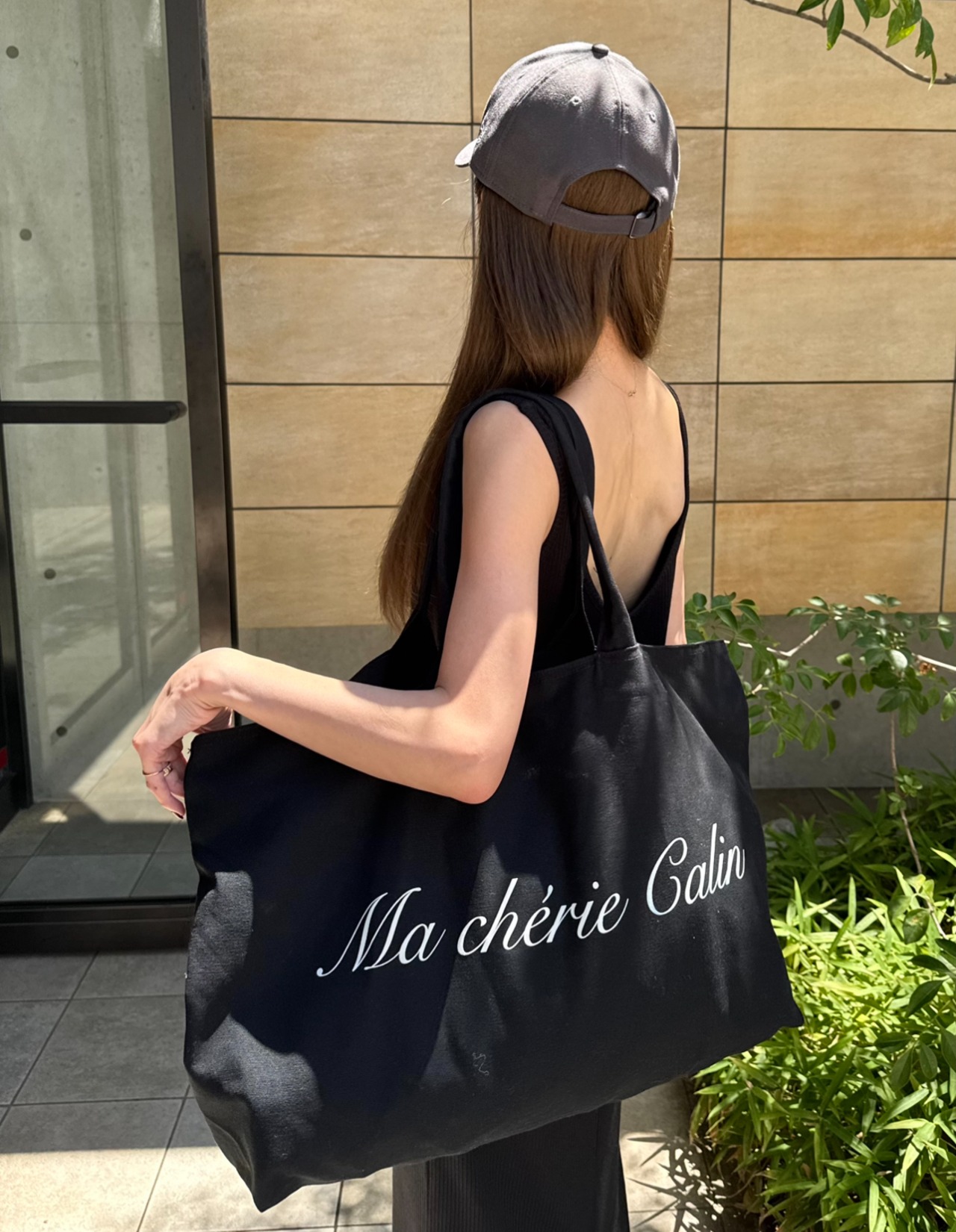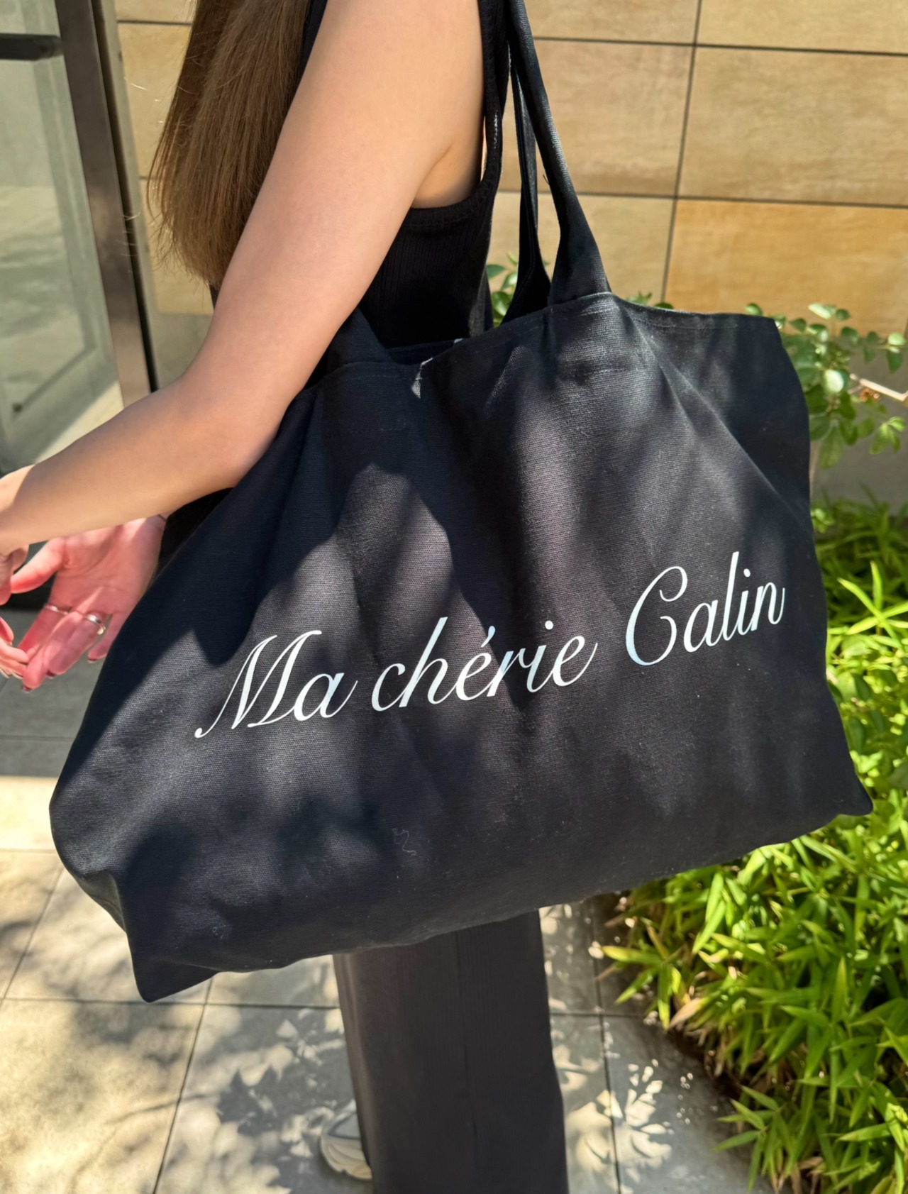 落ち着きと存在感を兼ね備えた、ブラックキャンバスに映えるホワイトロゴが魅力の「Machérie Calin」大容量トートバッグ。