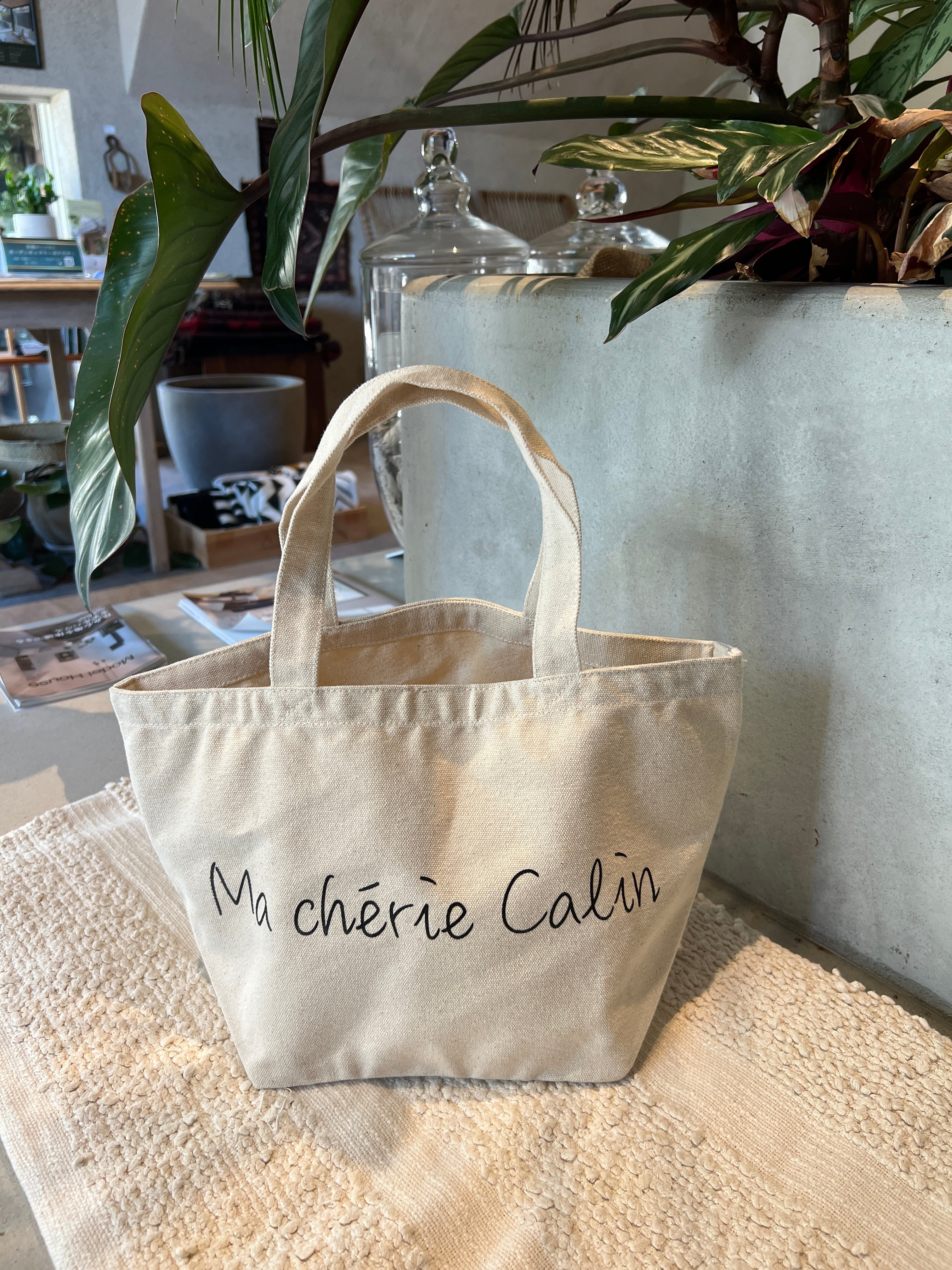 「Macherie Calin 」のロゴが映えるナチュラルカラーのミニトートバッグは、シンプルだけど大人可愛い仕上がり。